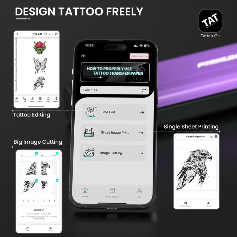 • Portable Tattoo Printer - Padieoe Tattoo Thermal Printer is designed to be compact and lightweight, with dimensions of 11.5*2.6*1.8in and a weight of only 1.77Ibs; Tattoo template printers bid farewell to the complex printing process; All you need to do is download and access the application, and then you can easily upload various images, adjust size and position, and create your personalized patterns