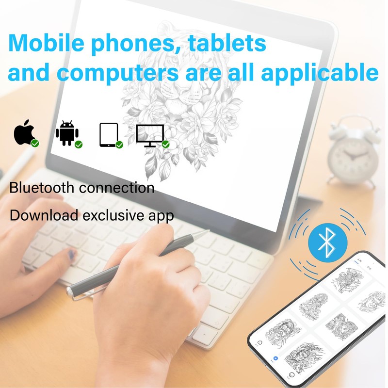 - Versatile Connectivity and Creative APP:Connect via Bluetooth to your Android or iOS devices, or use USB for Windows and Mac. The exclusive APP is a game - changer. It allows easy access to design files, precise stencil scaling and rotation for optimal body placement. Batch - print multiple images for creating composite designs, like combining tribal and floral elements. The built - in 3D body model offers realistic previews, crucial for stencil transfer and client communication.