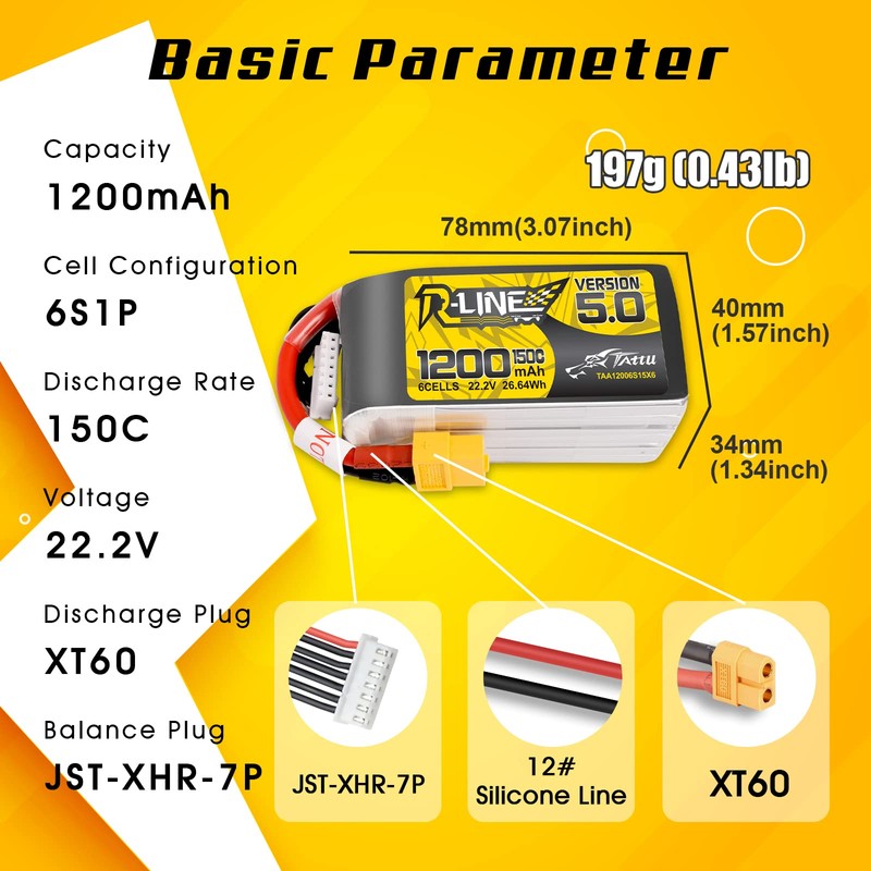 - Dimensions: Tattu 1200mAh 6S Lipo battery dimensions is: 78*40*34mm/3.07*1.57*1.34inch; Approx Weight: 197g/0.43lb
