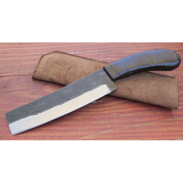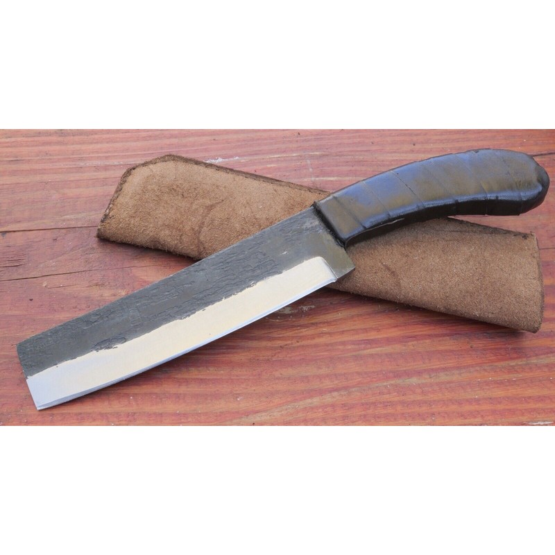 This 12" mini machete is a hand-forged chopper made of durable carbon steel. The black blade has a plain edge and a straightback design, perfect for everyday carry, survival situations, and boot camp. The leather-wrapped handle provides a comfortable grip for ambidextrous use. This knife comes with a sheath and is an original piece from Tattva Tactical.