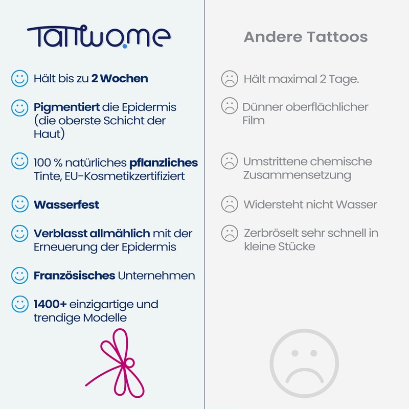 - Temporary tattoo of new generation - lasts 2 weeks: an innovative ink that penetrates the first layer of skin and lasts up to 2 weeks. Easy to use in minutes. Try it now!