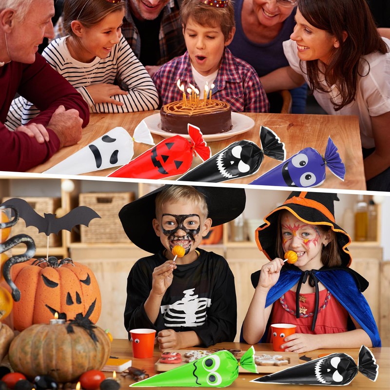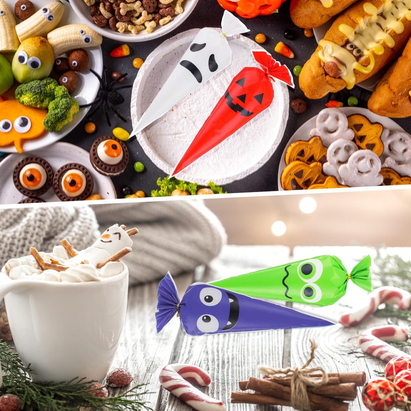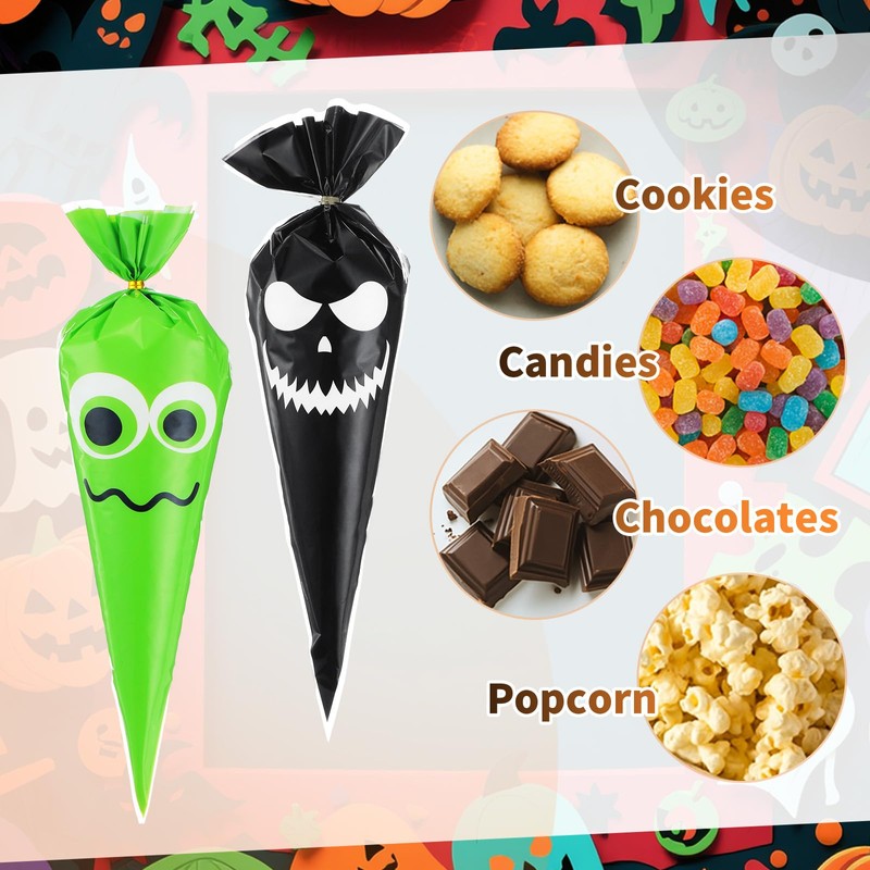 Tatuo 100 Pcs Halloween Candy Bags Pumpkin Patterned Cone Treat Bags Triangle Cellophane Pouch with 100 Pieces Twist Ties for Popcorn Goodie Cookie Halloween Party Favor (Ghost Face Pattern 2)