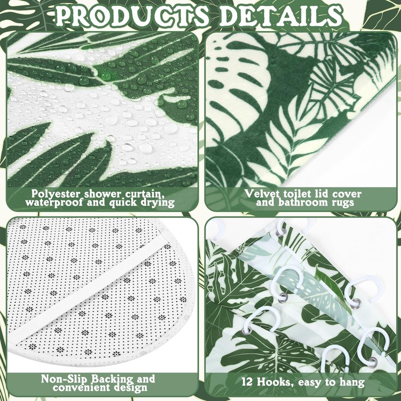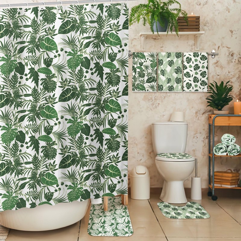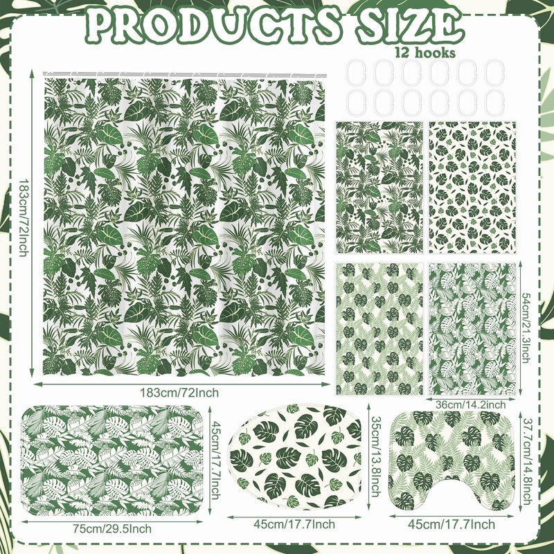 - Complete and Convenient Boho Bathroom Set: explore the convenience of our green leaves bathroom set; The set includes a shower curtain with 12 hooks, 2 bath mats, 1 toilet lid cover, and 4 different types of towels; Ideally sized to fit most bathrooms