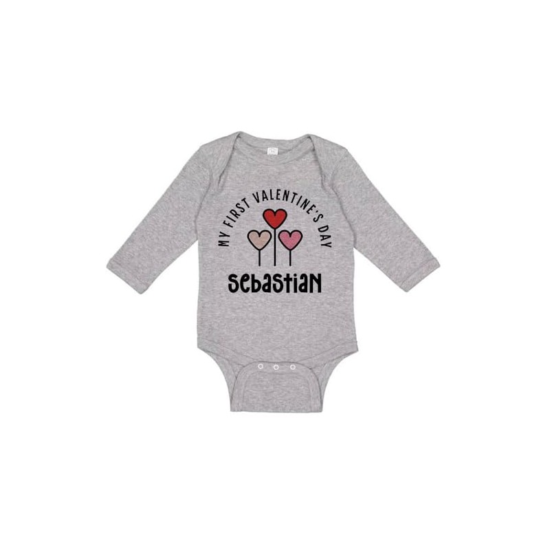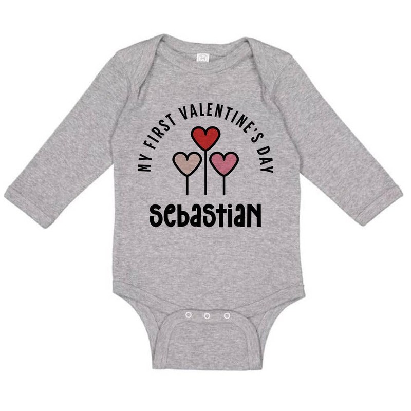 - Celebrate your little one’s first Valentine’s Day with this adorable custom design! Featuring the phrase "My First Valentine's Day" and personalized with the name “Sebastian” to celebrate!