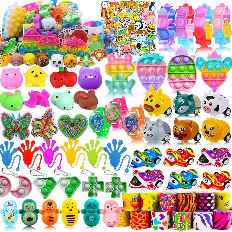 - Party Favor AssortmentThe 126pieces kids' party favor sets contains a rich variety of small toys that allow children to interact and play at parties, including: 3 cute pop toys keychains, 3 pop bracelets, 6 random shape mini pop keychains, 2 Maze Puzzles, 10 slap bracelets, 6 mochi squishies, 6 sticky hands, 6 animal Pull Back Cars, 6 Tumbler, 6 Pull Back Planes, 4 watch maze, 8 fluffy toys, 60 Stickers.