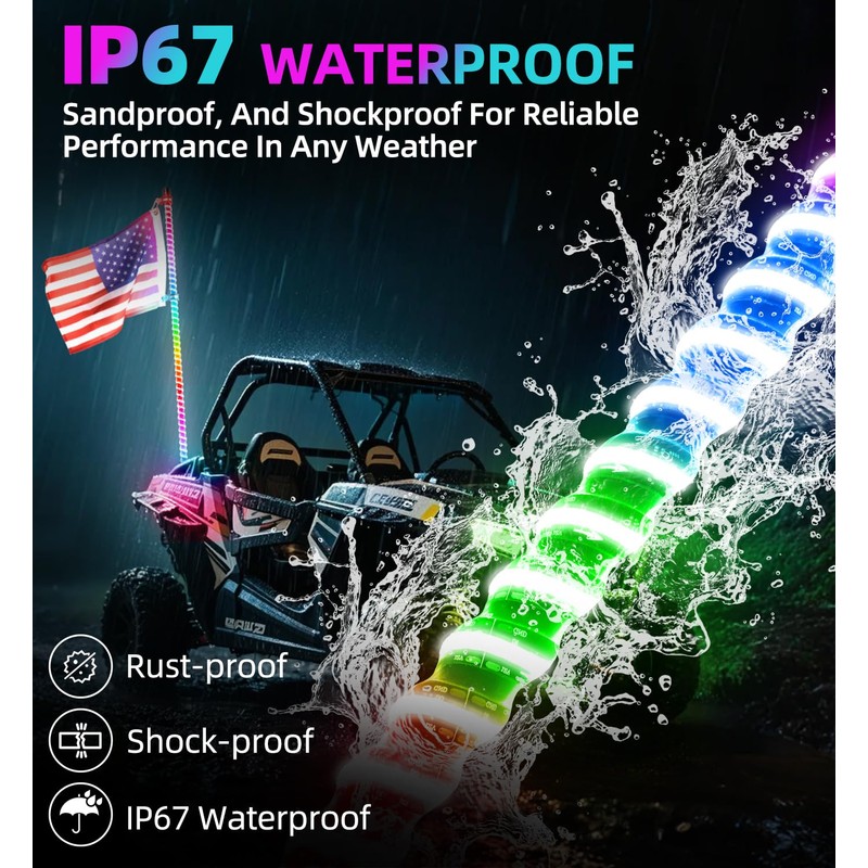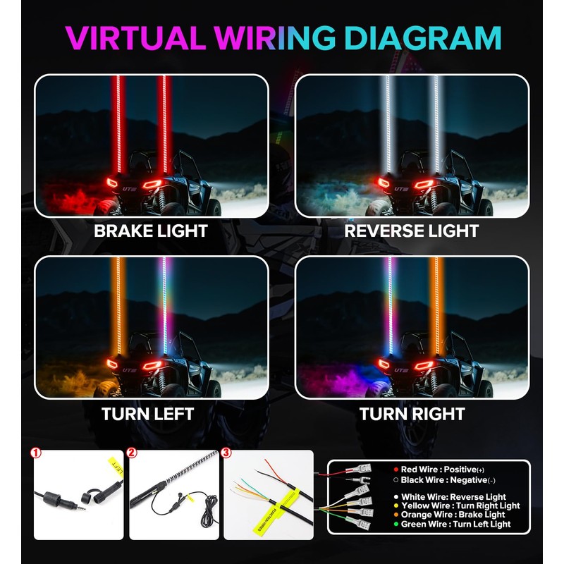 - Turn Signals and Diy: ATV whip lights integrating synchronized turn signals, brake lights, and reverse lights. you can DIY vibrant light color combinations to create your own unique, stylish lighting, making nighttime riding safer and more enjoyable.