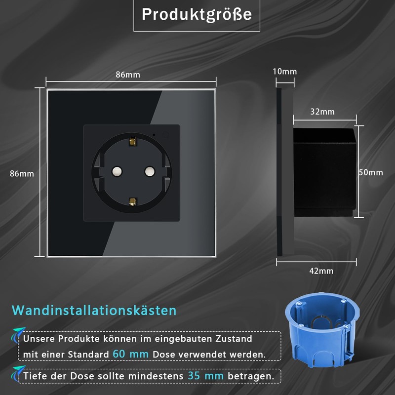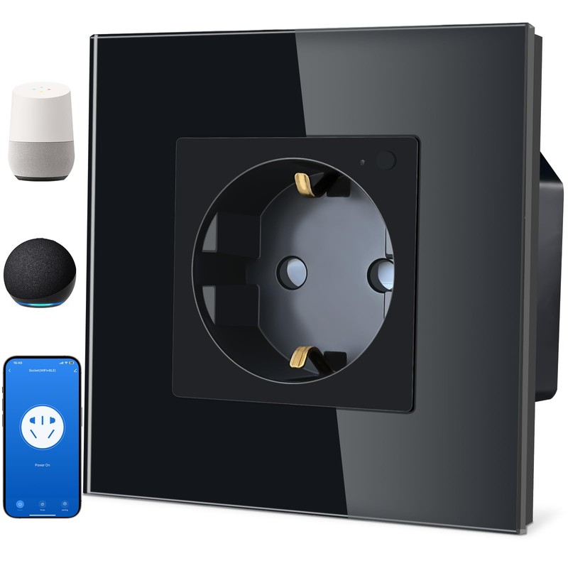 TAWOIA Schuko, smart socket, 1 compartment, 16A, app control, works with Alexa, glass frame, 86 x 86 mm, black, WiFi only 2.4 GHz
