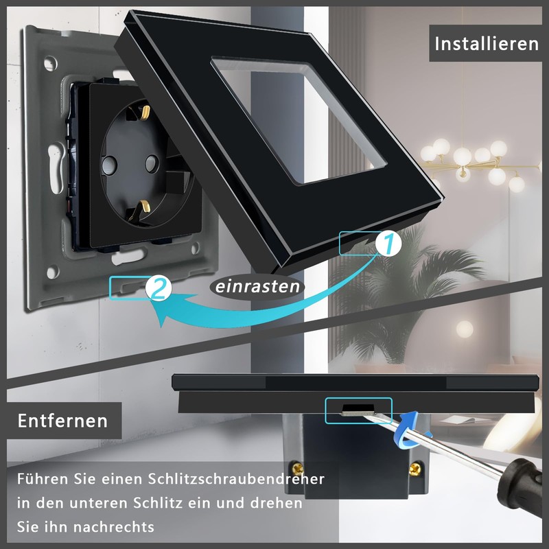 TAWOIA Schuko Smart Socket, 1 Compartment, 16A, App Control, Works with Alexa, Glass Frame, 86 x 86 mm, Black, WiFi Only 2.4 GHz
