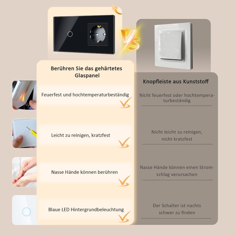 TAWOIA Switch with Socket Combination, EU Single 1 Way Crystal Glass Touch Switch, Type F Plug, Schuko, 16 A Socket, 157 x 86 mm