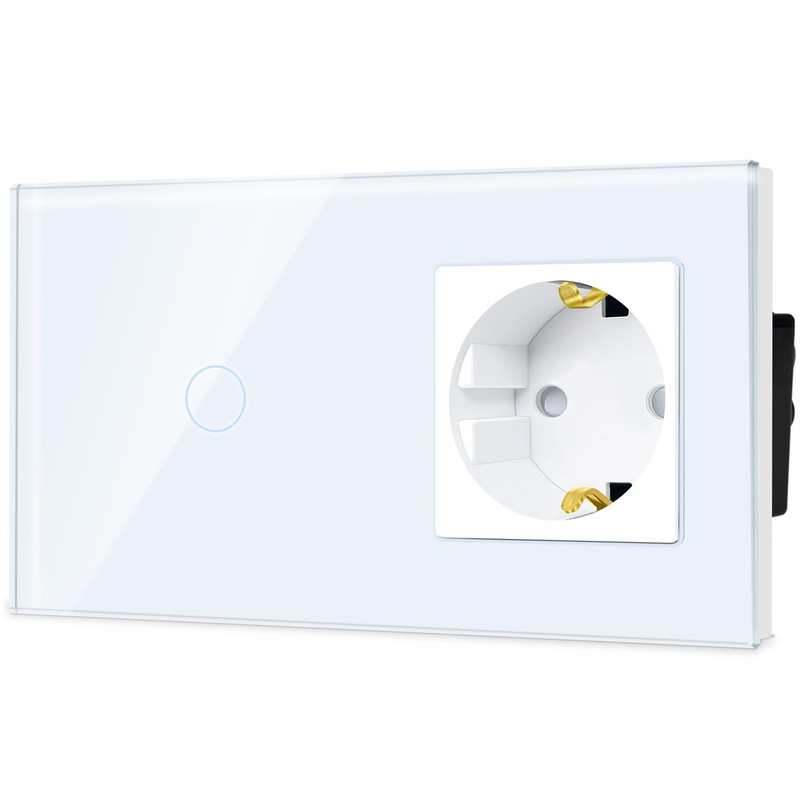TAWOIA Switch with Socket Combination, EU Single 1 Way Crystal Glass Touch Switch, Type F Plug, Schuko, 16 A Socket, 157 x 86 mm, White