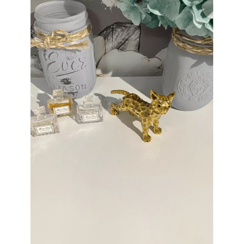 This trinket box features a gold leopard with encrusted jewels standing on all four legs and shiny emerald eyes. Store small jewelry in this box, gift to a friend or use as home décor!