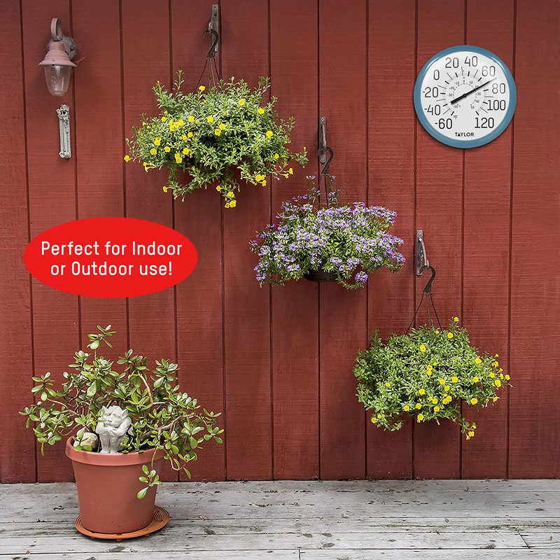 Taylor's 13.25" Big & Bold Dial Thermometer is a classic design, perfect for indoor and outdoor spaces. It measures a wide temperature range from -60°F to 120°F (-50°C to 50°C), making it ideal for any climate range, and has precision made thermometer coils for accurate temperature readings. There is a protective cover over the thermometer coil to guard against water, grass clippings, bugs and any other debris that may affect temperature readings. The coil cover also lessens temperature swings caused by direct sun exposure. The thermometer is weather resistant and shatterproof so it can be left up year- round without worry of damage or inaccurate readings due to extreme temperatures.