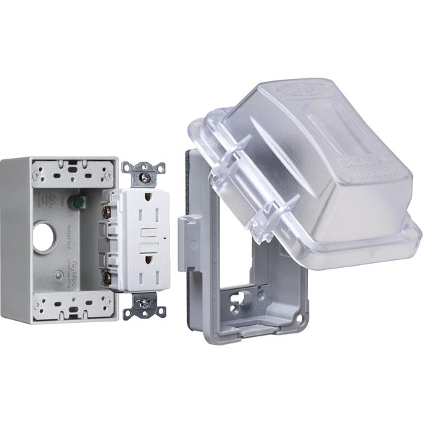 Extra-duty in-use weatherproof outlet kit. Designed for use when weatherproof protection is required for receptacles. Includes WR/TR 15-amp self-test GFCI (ground fault circuit interrupter), box, in-use cover, attached gasket, and mounting hardware. Features patented quick-fit keyhole mounting system for quick installation.