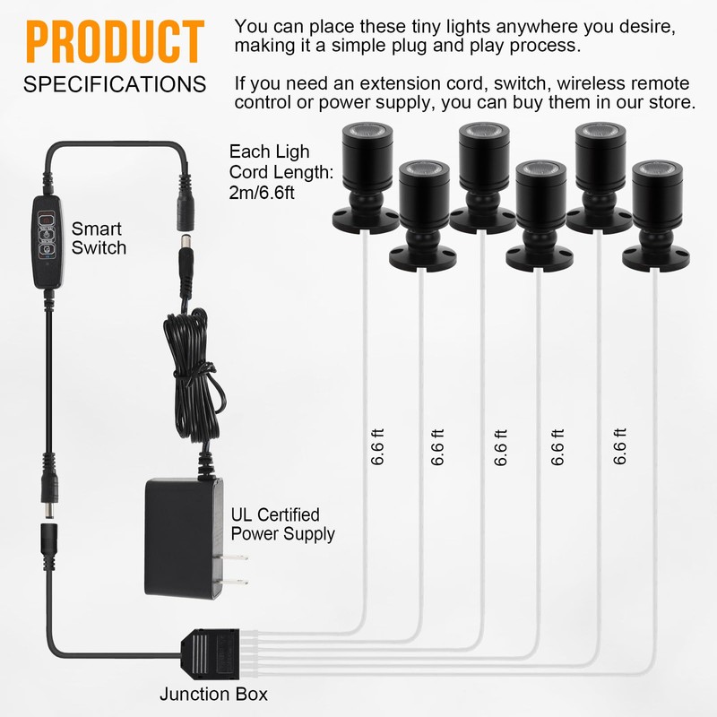 - 【Comfortable & Bright Illumination】Each display lights has 1.5 Watt,100 lumens and 6.6ft length cord.Cold White 6000K,With a Color Rendering Index of 85RA, our spotlights provide high-color accuracy and natural, non-flickering lighting, ensuring your eyes stay comfortable while enhancing your space.