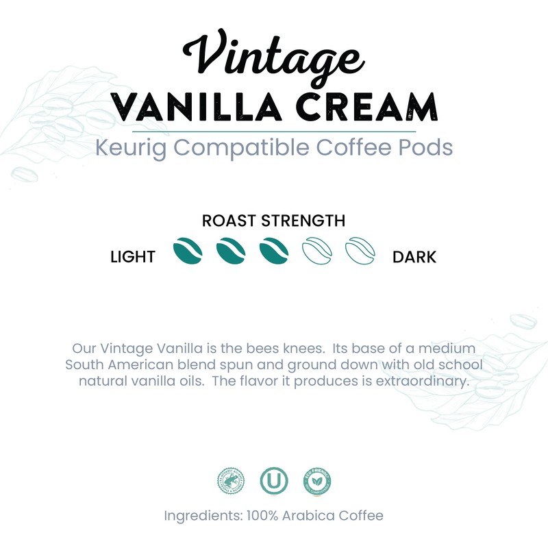 • 100 Vintage Vanilla Cream - Our Vintage Vanilla is the bees knees. Its base of a medium South American blend spun and ground down with old school natural vanilla oils.