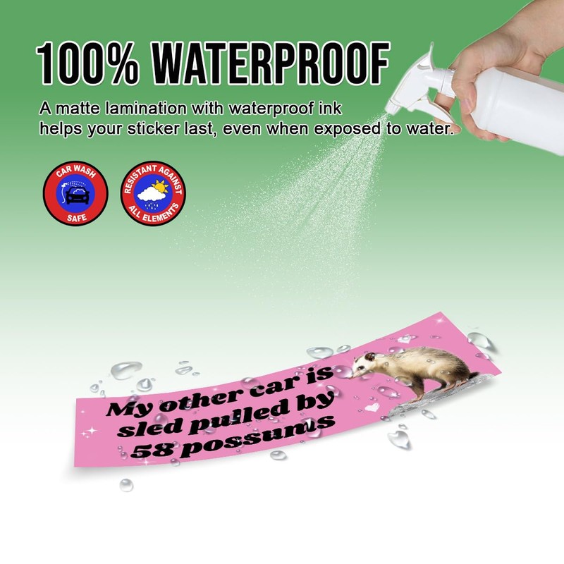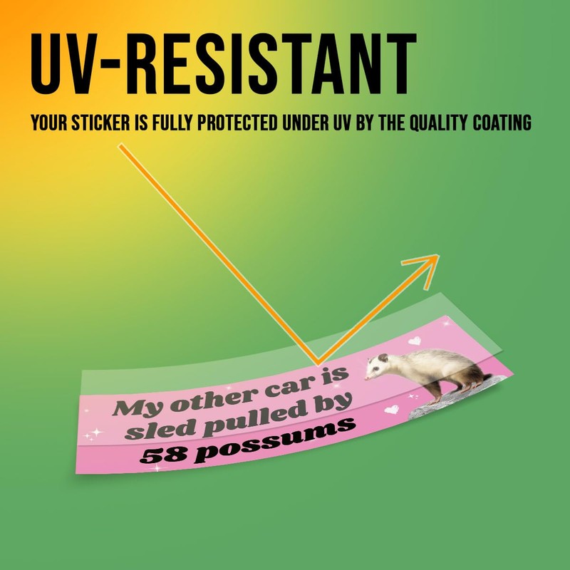- Unmatched Supper Strong, High Tack Adhesive: My Other Car Is A Sled Pulled By 58 Possums bumper sticker feature an adhesive of extraordinary strength and high tack. Stick them to any surface with confidence, knowing they won't peel or come off easily.