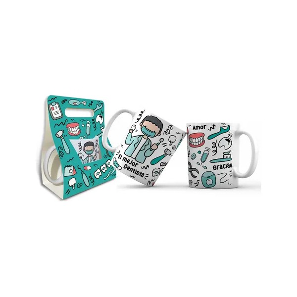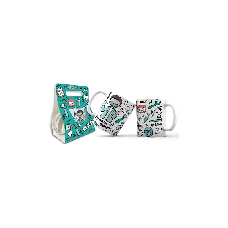 1 Taza blanca impresa con diseño odontológico (elige tu modelo preferido entre las variantes disponibles en esta publicación).