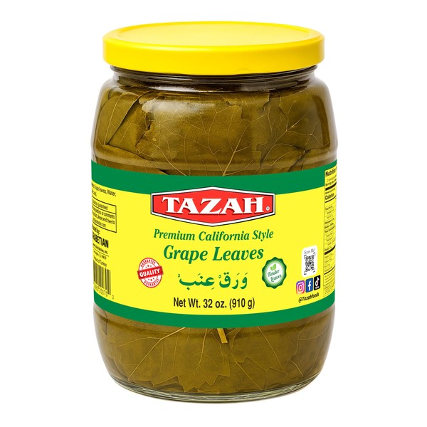 TAZAH California Style Turkish Grape Leaves in Jar – Vegan & Vegetarian – Perfect for Dolmas (Stuffed Grape Leaves) – Tender & Delicious – Net 32oz (Drained 16oz)