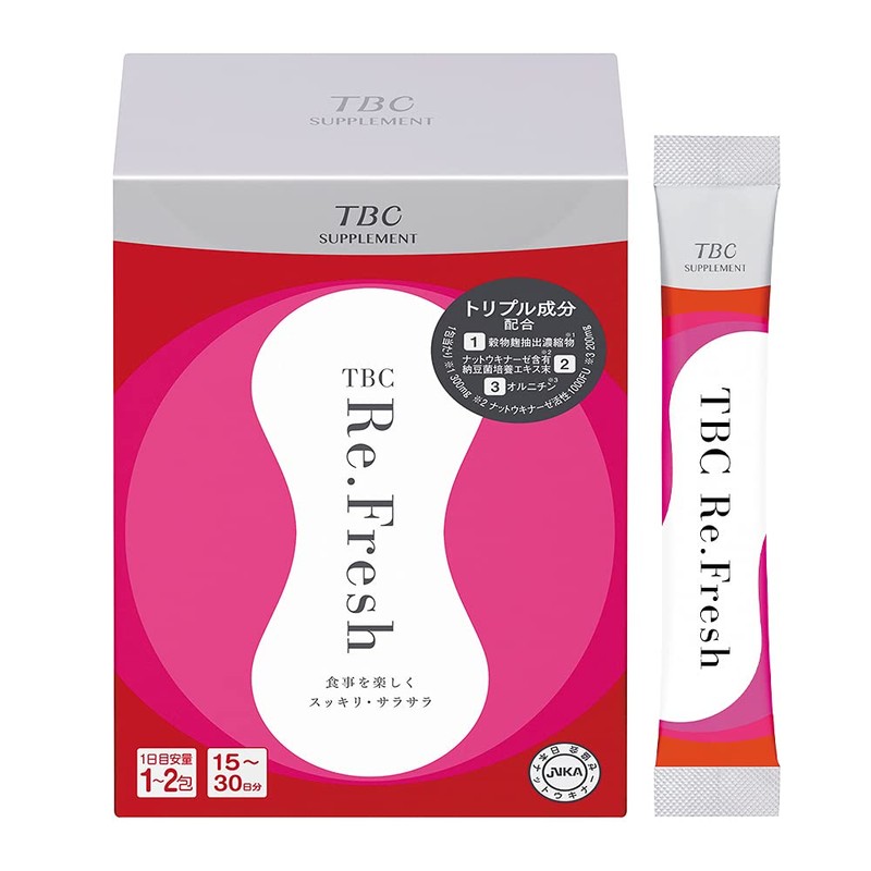 - 「TBC リ.フレッシュ」は、穀物麹抽出濃縮物、ナットウキナーゼ含有納豆菌培養エキス末、オルニチン等を配合した、ダイエットを考えている方をサポートするサプリメントです。