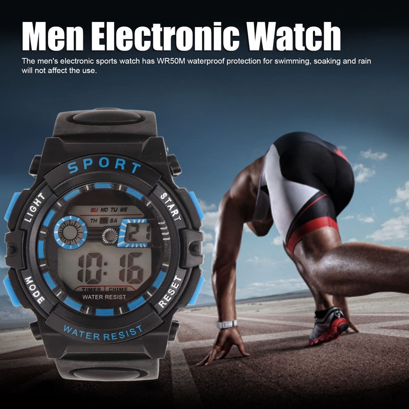 Tbest Electronic Men's Watch, Multifunctional Digital Sports Watch WR50M, Waterproof Watch with Luminous Light Alarm for Swimming, Running, black and blue, Strap.