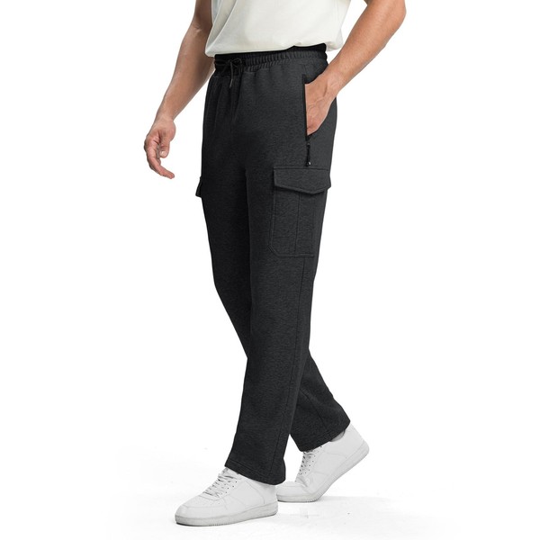 TBMPOY Men's Fleece Lined Sweatpants Winter Straight Leg Open Bottom Warm Cargo Pockets Cotton Running Lounge Deep Gray M