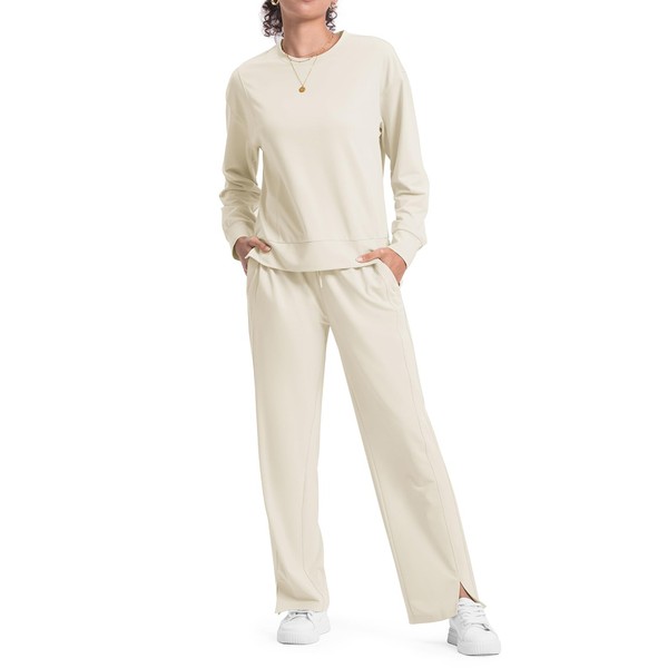 TBMPOY Women Travel Sweatsuit Casual 2 Piece Outfits Sweat Track Suit Lounge Long Sleeve Wide Leg Sweatpants Set Pockets Airport Athletic (Apricot,L)