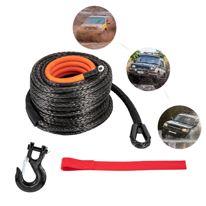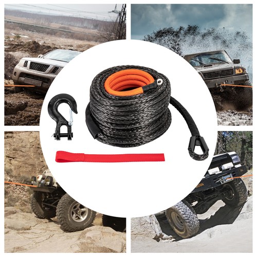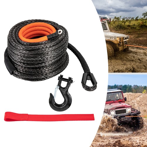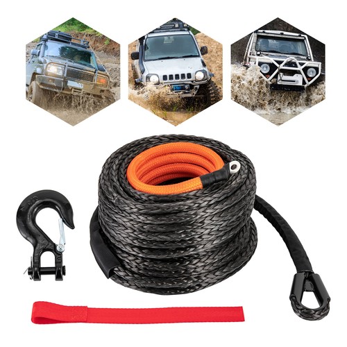 3/8" x 92FT Synthetic Winch Rope w/ Hook 25500LBS Recovery Cable Truck SUV Tow Key Features ??Good Material: The rope is made of premium polyethylene, which is acid and alkali resistant, corrosion-resistant, wear-resistant, rustproof, has high stability and tensile strength, and can be used for many years. The stainless steel hook is heat-treated to ensure high strength and durability. ??High Strength: It is made of tough polyethylene woven from 12 strands, with a breaking force of 25500 pounds, which is very powerful and can handle various tensile work. The unique self-tightening rope feature helps hold the rope securely on the winch drum. ??Powerful Function: It's soft but firm to ensure that it is not easy to loosen at knotting. Additionally, it does not rebound to harm the car and you