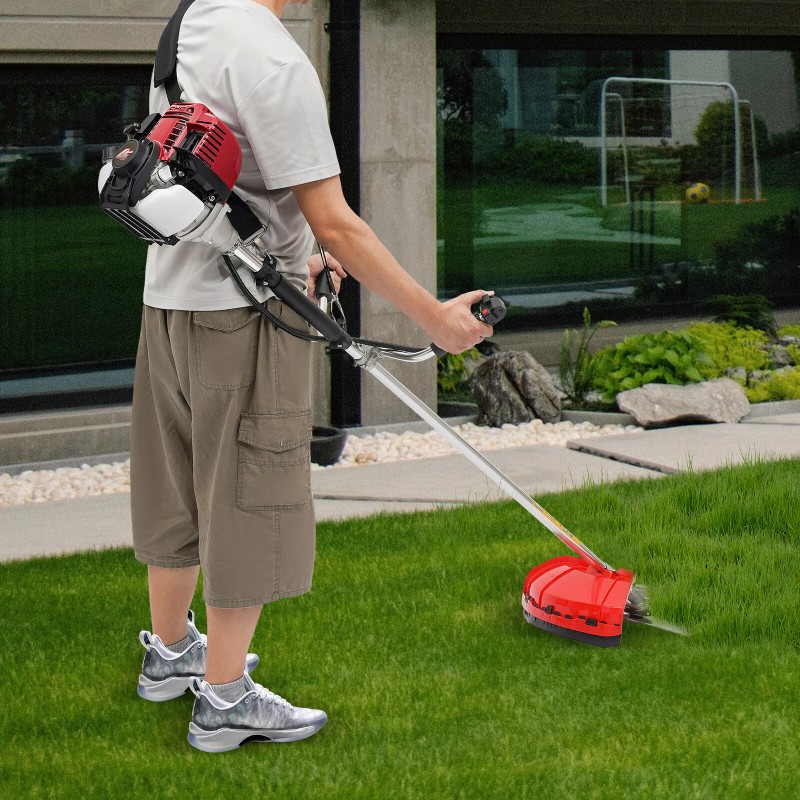 This gas-powered brush cutter is powered by a powerful 38.3cc four-stroke engine that can cut grass quickly and deliver a powerful power of about 1050W. Its manganese steel blade can sweep through many kinds of grass. Its shoulder strap and handle make maneuvering more comfortable and stable. This is an efficient, versatile, and durable gardening tool.
