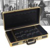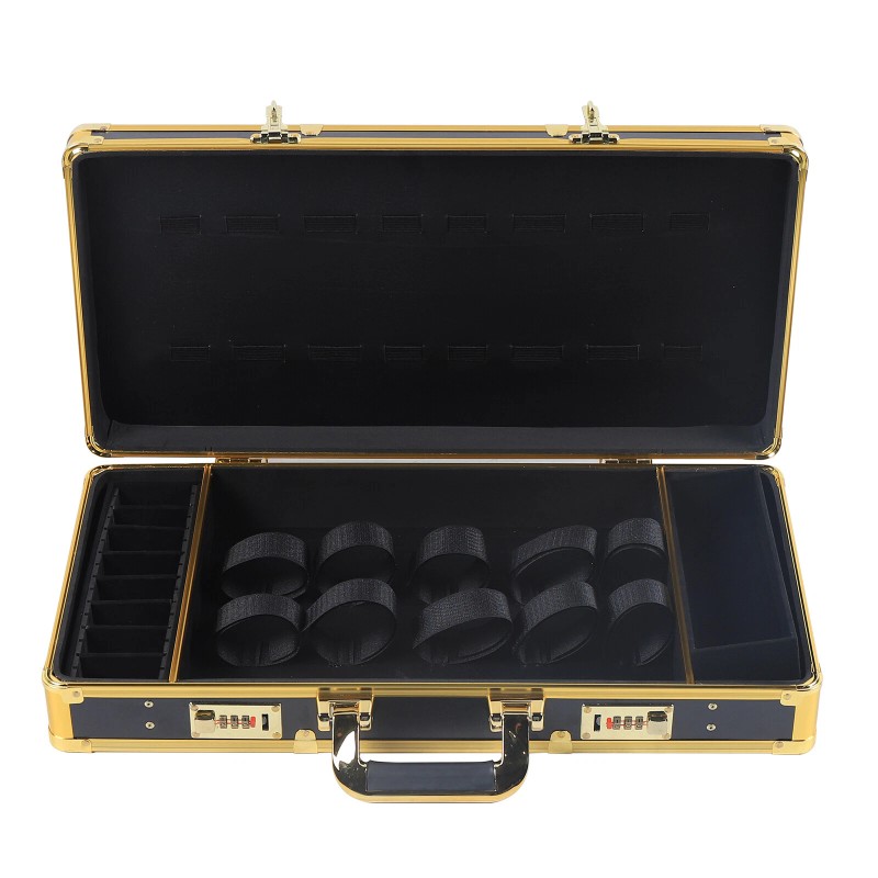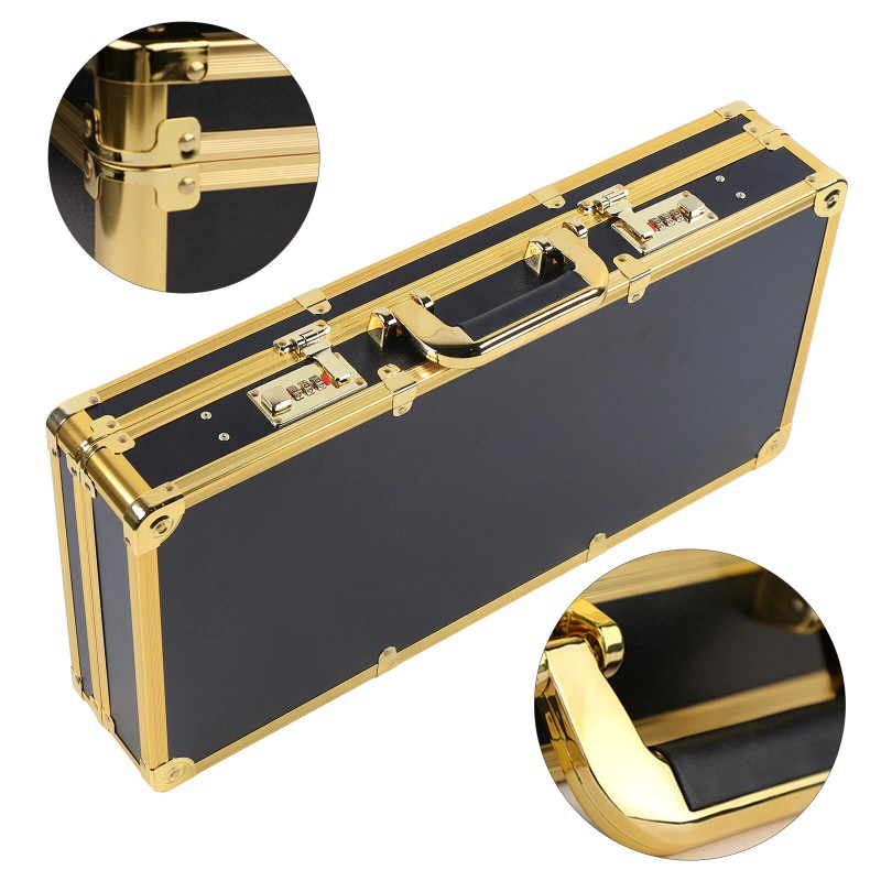 Top grade aluminum finish and construction, reinforced steel corners for extra durability, beautiful smooth black finish, classic golden trim.