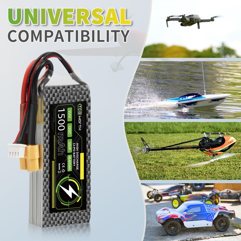 TCBWORTH 11.1V 3S Lipo Battery 120C 1500mAh with XT60 Connector for Airplane Rc Remote Control Car
