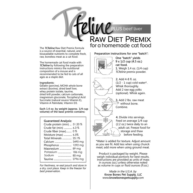 • TCfeline Premix... A powder supplement when combined with fresh RAW meat makes a complete, balanced, all natural, homemade raw cat food. Specially formulated to mimic your cats natural diet…THE MOUSE.