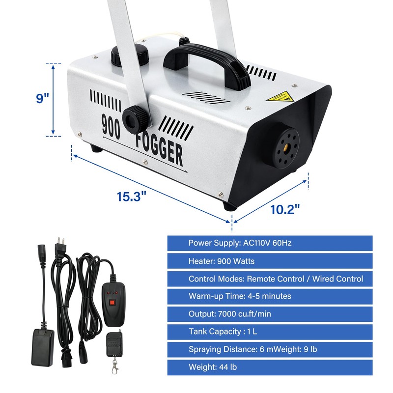 - 【High Output Fog Mashine】Voltage: AC110V 60Hz. Power: 900W. Output: 7000 CFM (c.f./min). Spraying distance : 6m/19.68ft. Tank capacity: 1L for long lasting fog production. It create a sense of mystique and something truly unique at your next event with this smoke fog machine.