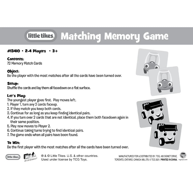 - Match the most cards to win in this Little Tikes memory learning card game. Playing this game can help kids recognize matches and improve their concentration and visual memory; important for reading, writing, and lots of everyday activities. The deck has 36 matching pairs; use some or all to adjust the level of difficulty for one or more players.