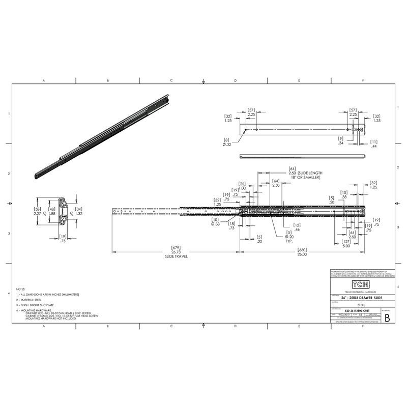 TCH Hardware 26 Inch Heavy Duty 250 lb Steel Drawer Slides - 3/4" Wide - Full Extension with Over Travel | Side Mount Ball Bearing Drawer Rails