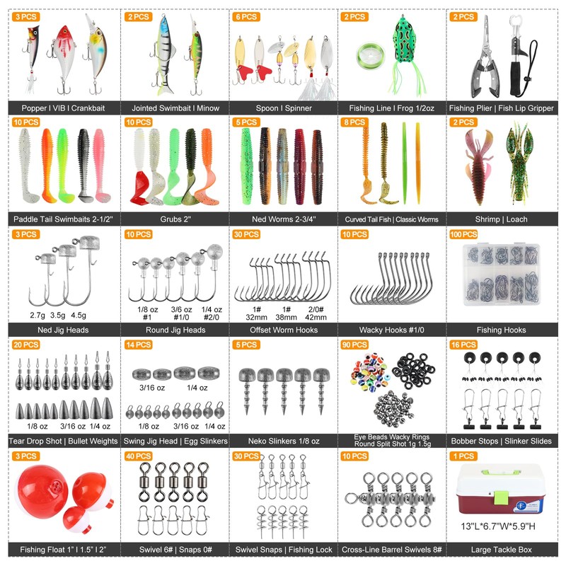 • 【Comprehensive Fishing Kit】 - It's a complete package with essential tools like pliers and a fish gripper, plus a full set of fishing accessories. It simplifies preparation, making fishing more hassle-free for impromptu trips. The tackle box with tackle included 1 plier and gripper, 2 crankbaits, 1 popper, 1 minnow, 1 pencil, 1 frog, 36 soft lures, and a box of 100 fishing hooks. It also features 40 offset worm hooks, 13 jig heads, 79 weights, and more to cater to diverse fishing needs.