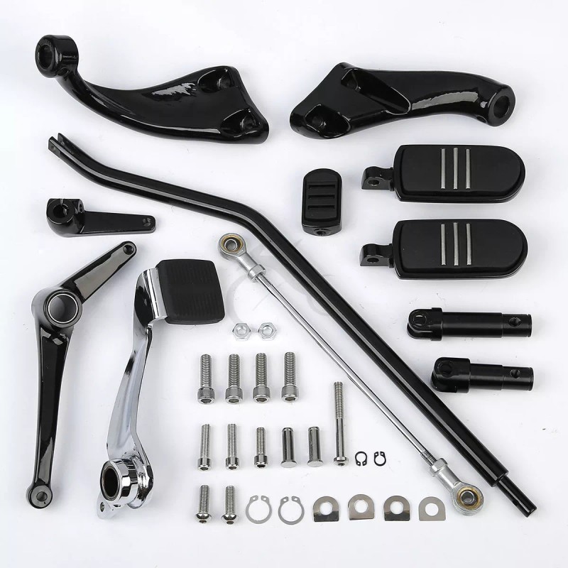 This kit extends the rider foot controls a full 3.5" forward, .9" out, and .375" up of the stock location, providing the tall rider a stretched out comfortable riding position.
