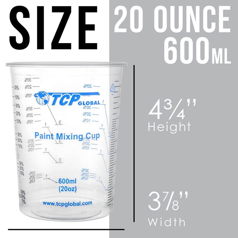 TCP Global 20 Ounce (600ml) Disposable Flexible Clear Graduated Plastic Mixing Cups - Box of 25 Cups & 25 Mixing Sticks - Use for Paint, Resin, Epoxy, Art, Kitchen - Measuring Ratios 2-1, 3-1, 4-1, ML
