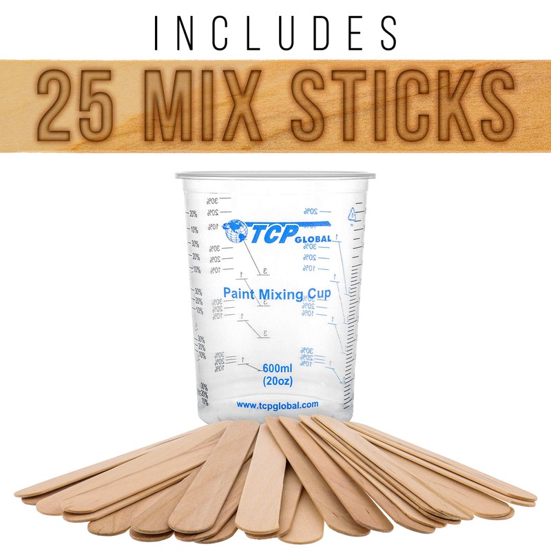 - Mixing Cup Kit with 25 - 20 Ounce (600 ml) disposable flexible, clear graduated plastic mixing cups along with 25 mini wooden paint and liquid mix stick paddles.