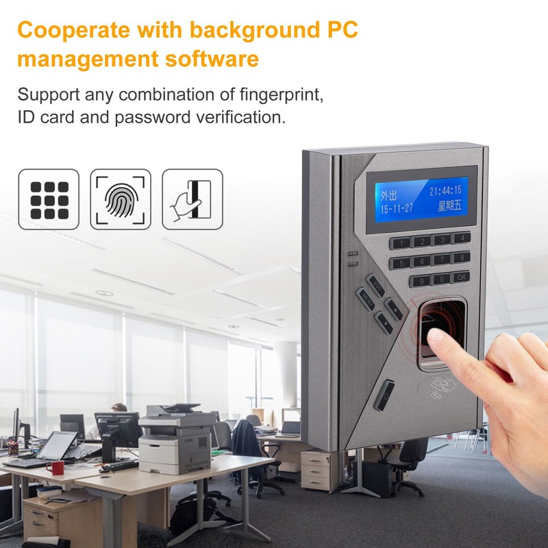 1、Support any combination of fingerprint, ID card and password verification, flexible and safe to use. Large capacity, support 3000 fingerprints, 3000 cards and 100,000 records. 2、The user can modify the password to open the door by himself, and the keyboard can be used to delete the card number after the card is lost, which completely eliminates security risks. 3、The biometric fingerprint reader uses advanced algorithms to ensure reliability, accuracy and excellent matching speed. The dark‑backlit optical collector is used to solve the interference of dry fingers and outdoor strong light. 4、Standard TCP/IP, U disk, RS485 communication interface, realize the networking of multiple access control and the mutual setting of the computer to the equipment. 5、Cooperate with background PC management software to realize integrated management of access control and attendance. High receiving sensitivity, small working current, and the performance is high.
