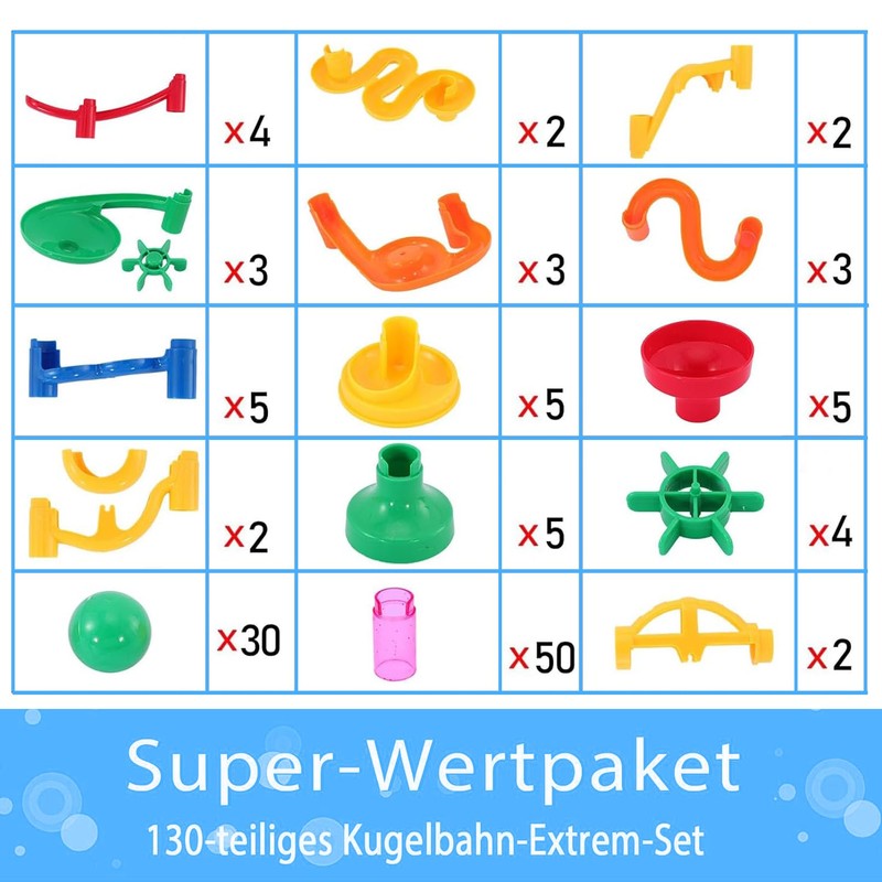 - 133 Pieces Marble Track Toys This set includes 53 different track elements, 50 pipe connectors and 30 colorful marbles. All parts can be combined with each other, so children can build countless own models and let their creativity run wild.