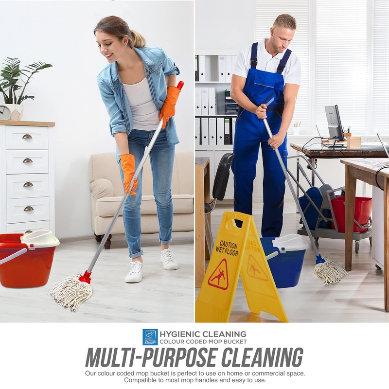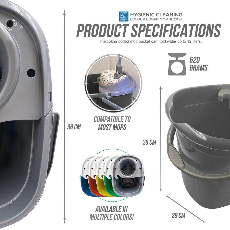 - Colour Coded Bucket for Mop ? The colour coded mopping bucket is made to avoid cross-contamination from different areas, making these buckets sets perfect for commercial cleaning for food hygiene such as fast-food outlets and restaurants. To add more color choices to our customers especially for those in need for domestic use, we also supply this stylish silver/grey mop bucket ideal for general-purpose home cleaning.