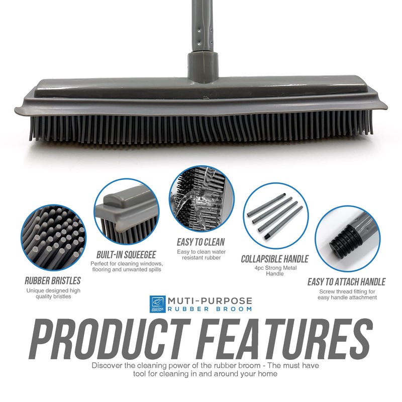 • Multipurpose Rubber Sweeping Brush Indoor C Not only it is an effective rubber broom indoor that removes pet hair from your carpet, but this soft broom floor brush can also keep your home tidy! It can easily attract and sweep dirt and dust in every corner of your home and can be used in laminated, vinyl, carpet, tiled, or wooden flooring. Also suitable as an artificial grass brush, the durable bristles can withstand the demand of a rubber broom outdoor use.