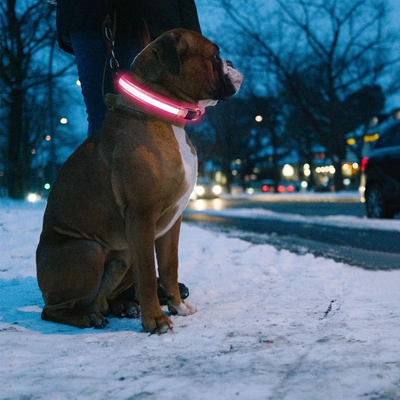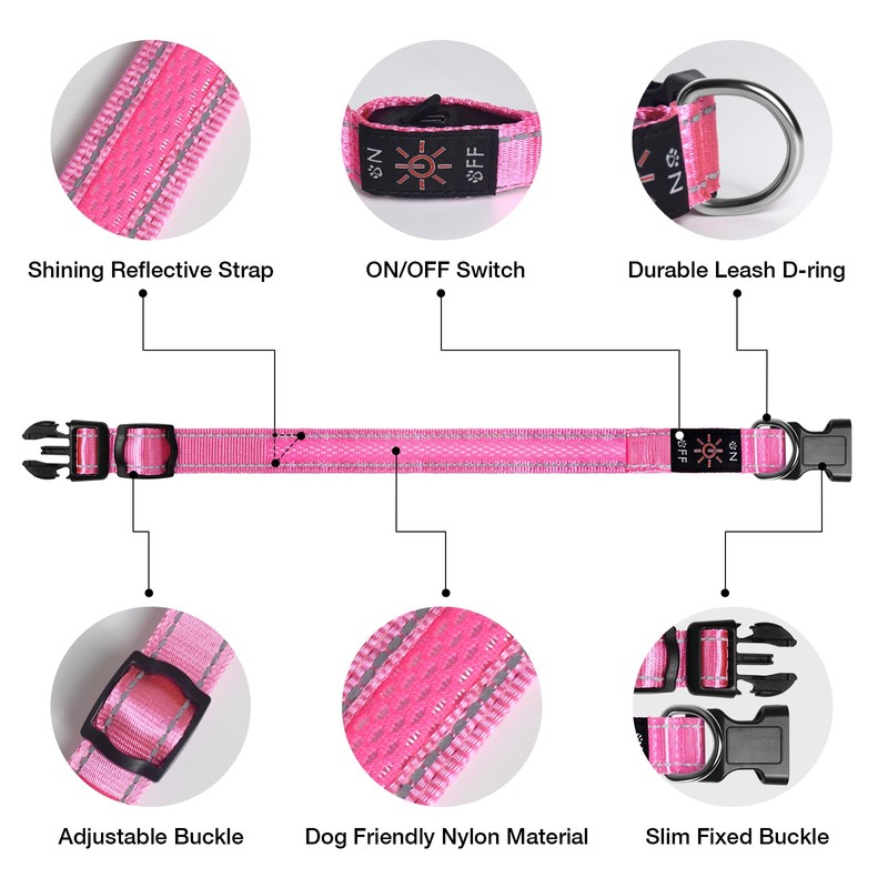 A led light up dog collar is essential at night, it can keep your dogs safe at darkness night time. And the led is rechargeable which is environment friendly. The dog collars for small medium large dogs comes with 2 reflective lines double safeguard your dogs. Every dogs should have a perfect fit and beautiful fancy dog collars to show their personality, beauty and naughty. All the dog collars for small dogs we made are with premium quality, durable nylon fabric, sturdy D-ring for easy leash attachment and lightweight plastic safety buckle. It can help increase the dog collar’s durability, sturdy and solidity.