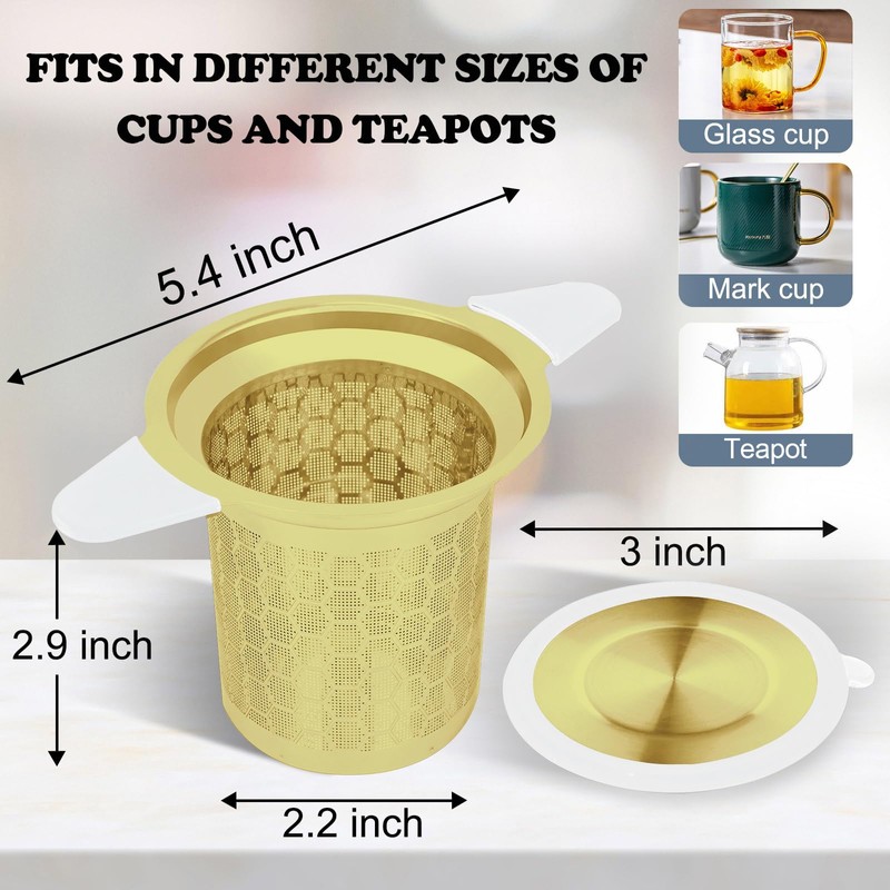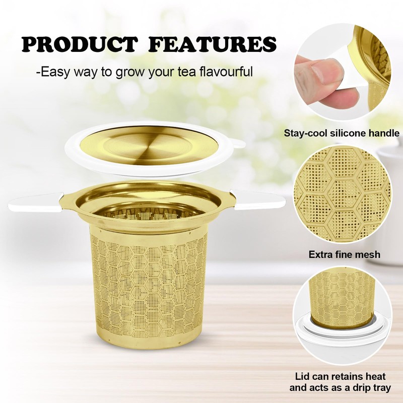 Tea Infuser for Loose Leaf Tea, Extra Fine 304 Stainless Steel Tea Strainer Stepper with Heat-Resistant Silicone Handles and Lid, Large Capacity Tea Basket Filter for Mug, Cup (Gold)