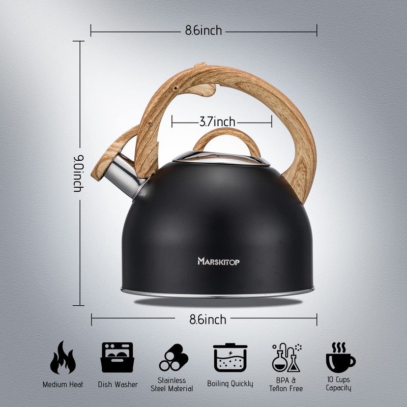 - Food-Grade Material: Whistling tea kettle for stove uses professional food-grade stainless steel materials to ensure that it is rust & corrosion resistant and heats up quickly. Also, a concise design makes the tea kettle appear more elegant.
