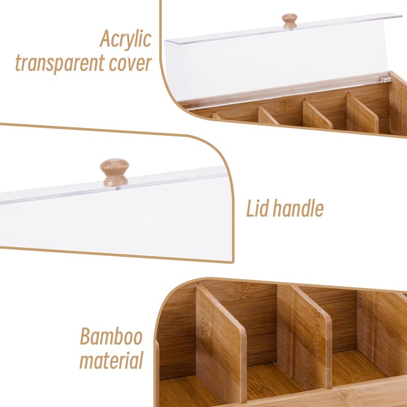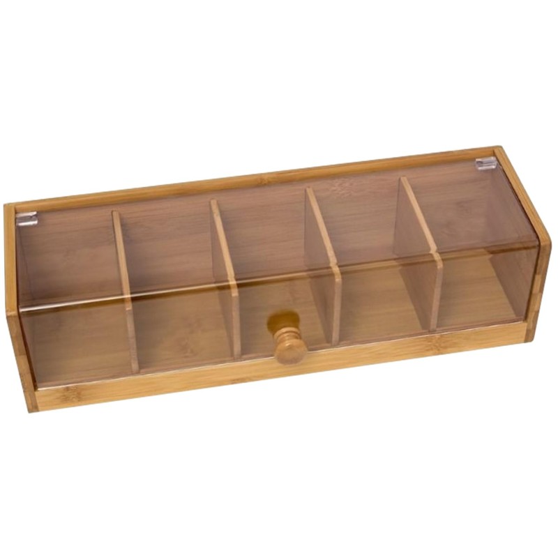 Keep your tea collection tidy and stylish with the Natural Bamboo Tea Selection Box, a practical and elegant storage solution. Featuring 5 spacious compartments, this tea organizer is perfect for tea bags, coffee sachets, and small kitchen essentials. Crafted from eco-friendly bamboo, it includes a transparent, dustproof lid for freshness and easy viewing. Ideal for kitchens, offices, or as a thoughtful gift, this versatile tea caddy combines functionality and charm.