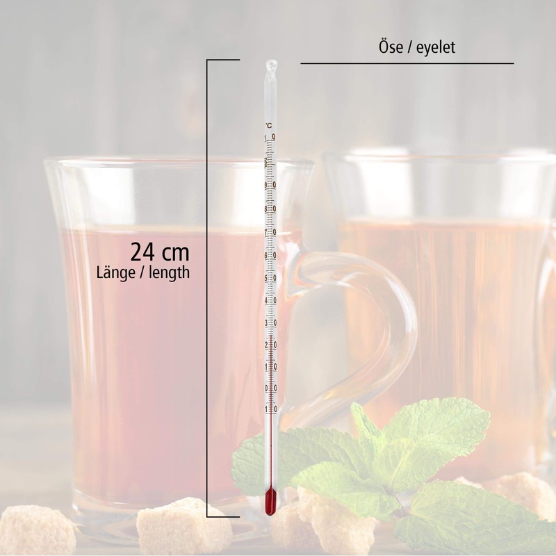 - Lantelme tea thermometer glass analogue thermometer with cord for hanging. The handy tea glass thermometer with temperature display from -10 °C to +110 °C