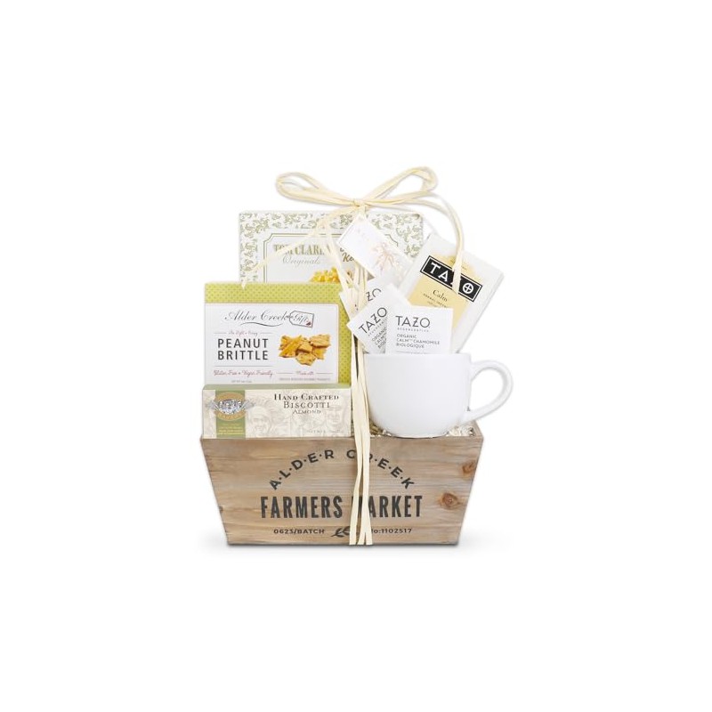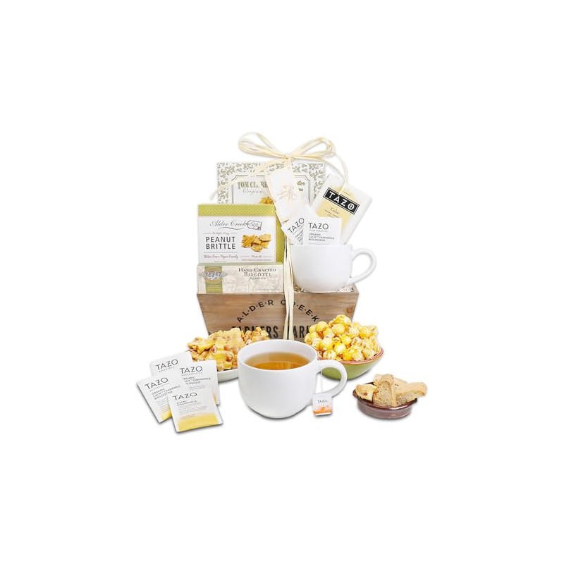 - What's Included: Tom Clark’s Brown Butter Kettle Popcorn (5oz.), Old Fashioned Peanut Brittle (4oz.), Tazo Calm Tea (2pk.), Nonni’s Biscotti (1pc.), Reusable Ceramic Latte Mug, Natural Wood Crate