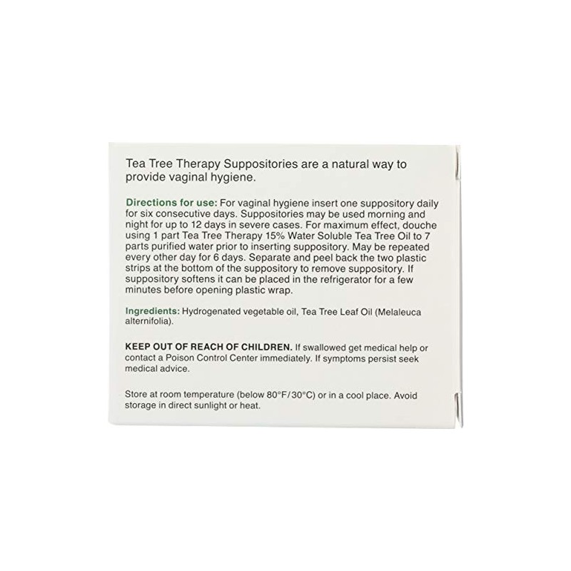 Product descriptionTEA TREE THERAPY 1x 6 PK TEA TREE SUPPOSITORIES. Relieves vaginal itching. Soothes inflamed tissues. Controls yeast infections.:. (Note: This product description is informational only. Always check the actual product label in your possession for the most accurate ingredient information before use. For any health or dietary related matter always consult your doctor before use.)IngredientsNULL Deionized Water, Sorbitol, Tea Tree Oil, (Oil of Melaleuca alternifolia) Natural Mint Flavor, Citric Acid, Sodium Citrate.NULL Deionized Water, Sorbitol, Tea Tree Oil, (Oil of Melaleuca alternifolia) Natural Mint Flavor, Citric Acid, Sodium Citrate.DirectionsFollow directions as mentioned on product label.