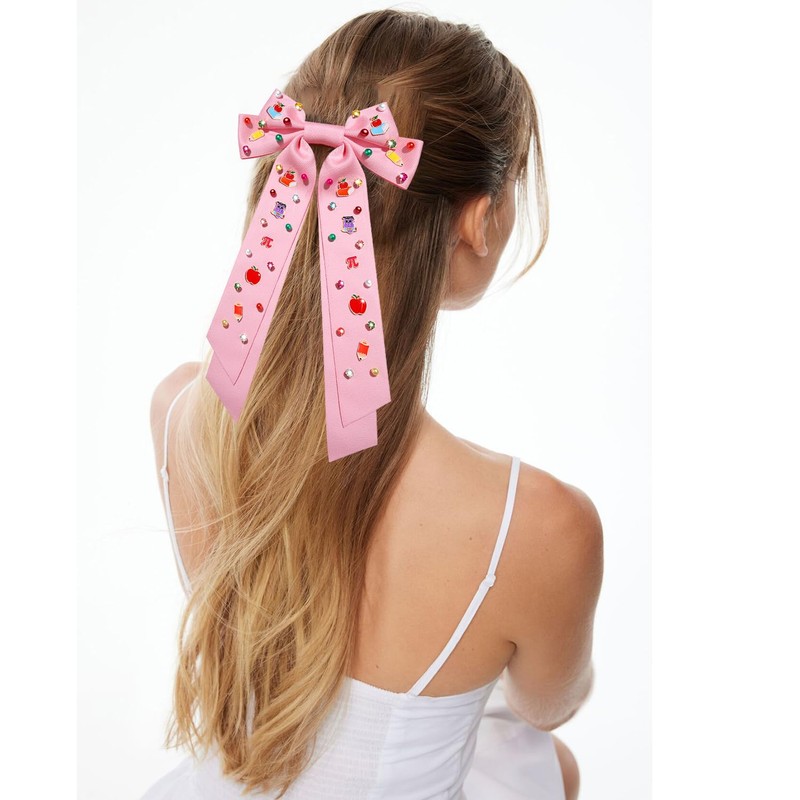 - ღ Teacher Hair Bows: Show the love and appreciation to your teachers with our New Collection of Back To School Hair Bows. Features classic bow-knot design, accent with sparkling crystal gemstones and cute school element charms like book, pencil, letters, these large white/pink/black hair bows are the perfect trendy teacher accessories to express your appreciation for all their hard work, whether you're looking for a gift for Teacher Appreciation Day or just want to show your gratitude